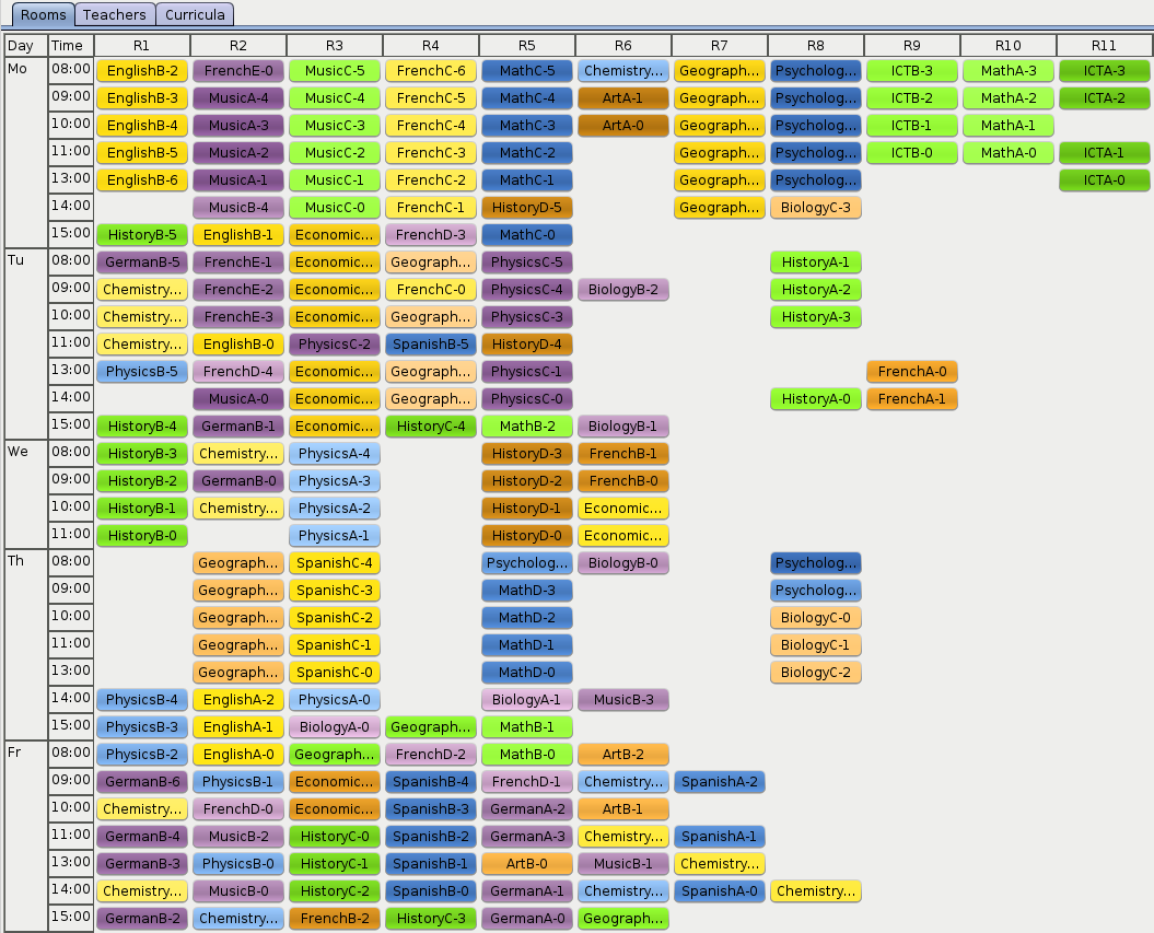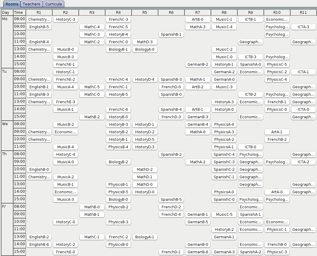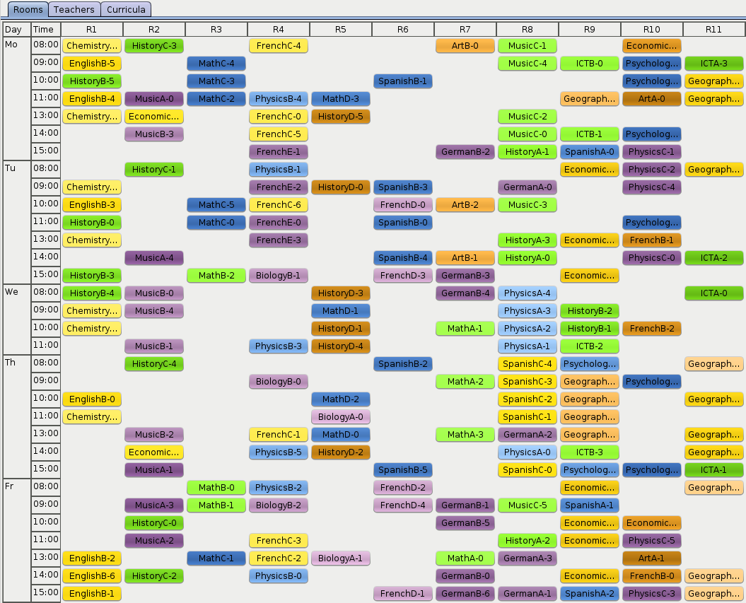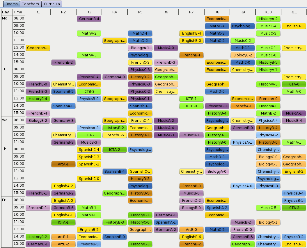 As OptaPlanner finds better and better solutions, there is less and less orange on the heat map. Looks like the history courses are particularly hard to schedule. Maybe the school should look for an additional history teacher?